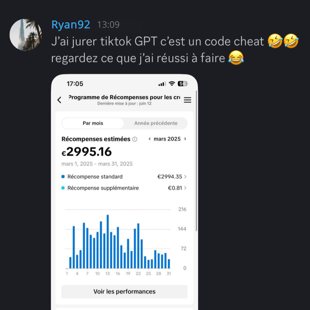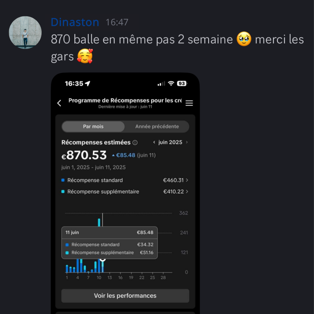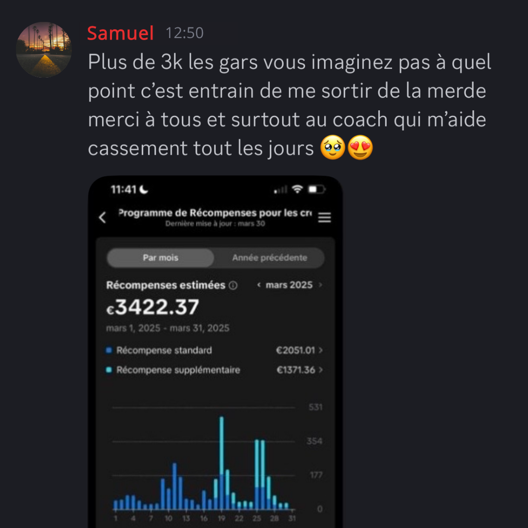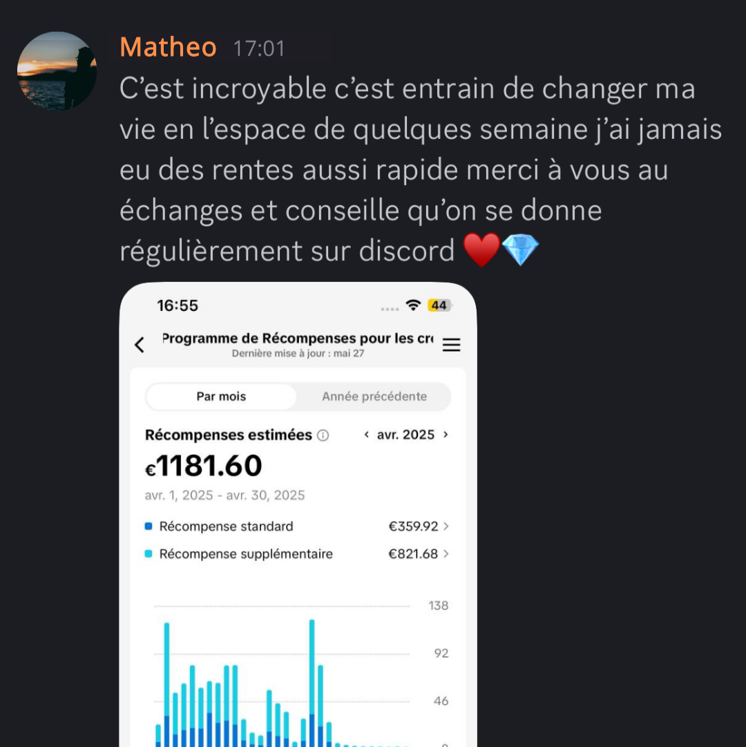 Au sein de notre Discord privé, vous rejoignez une communauté de membres engagés : partagez vos avancées, découvrez les résultats inspirants des autres et accédez à plus de 25 niches rentables avec des exemples concrets de contenu et les profils clés à suivre pour nourrir votre créativité. De plus, un à deux lives hebdomadaires vous offrent des conseils exclusifs en direct, la possibilité de poser toutes vos questions et l’analyse publique de vos comptes avec des astuces constamment mises à jour.