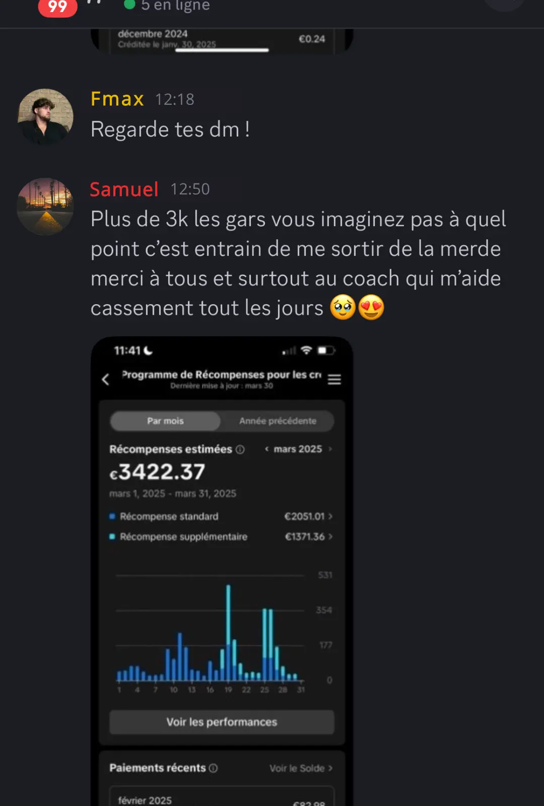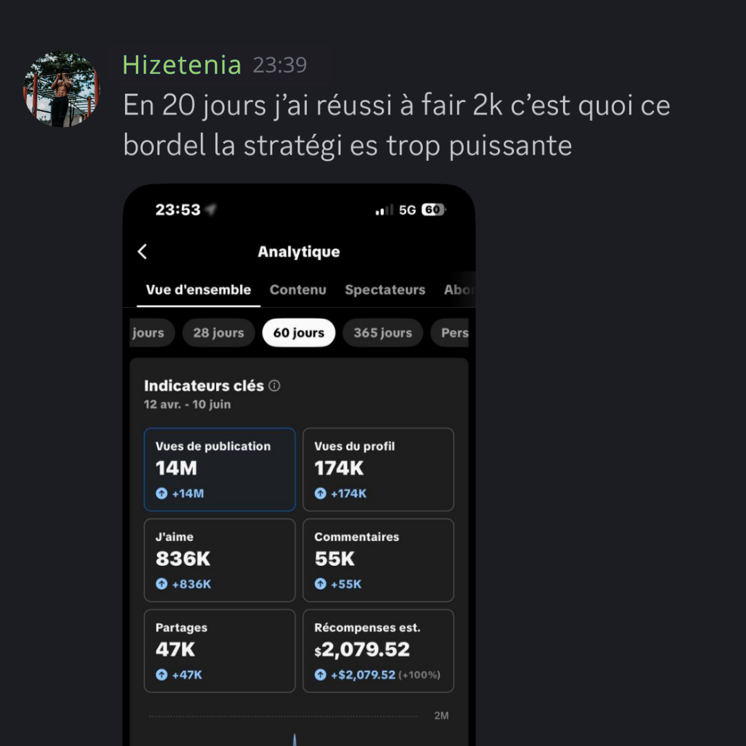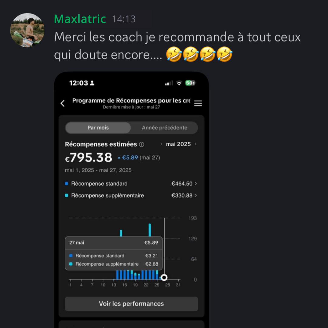 Au sein de notre Discord privé, vous rejoignez une communauté de membres engagés : partagez vos avancées, découvrez les résultats inspirants des autres et accédez à plus de 25 niches rentables avec des exemples concrets de contenu et les profils clés à suivre pour nourrir votre créativité. De plus, un à deux lives hebdomadaires vous offrent des conseils exclusifs en direct, la possibilité de poser toutes vos questions et l’analyse publique de vos comptes avec des astuces constamment mises à jour.